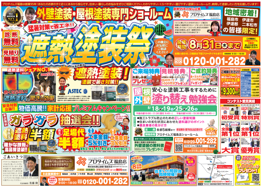 | お問い合わせ | 【プロタイムズ福島店 ㈱郡山塗装】 お問い合わせ番号:0120-001-282 WEBからのお問い合わせも可能です。 https://protimes-fukushima.com/contact/ |