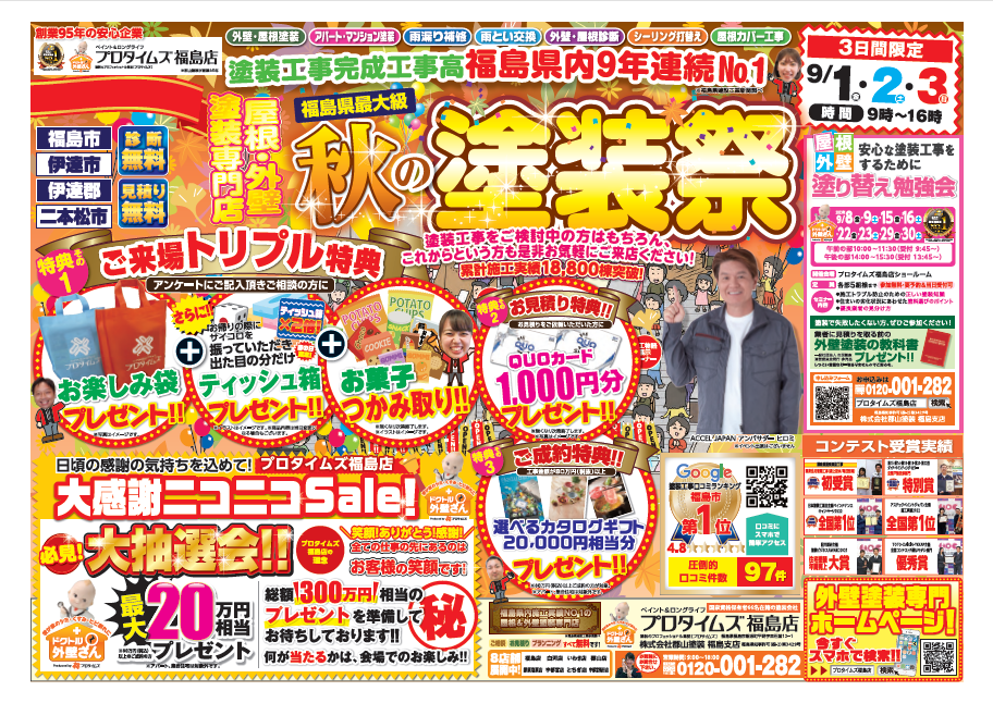 | お問い合わせ | 【プロタイムズ福島店 ㈱郡山塗装】 お問い合わせ番号:0120-001-282 WEBからのお問い合わせも可能です。 https://protimes-fukushima.com/contact/ |