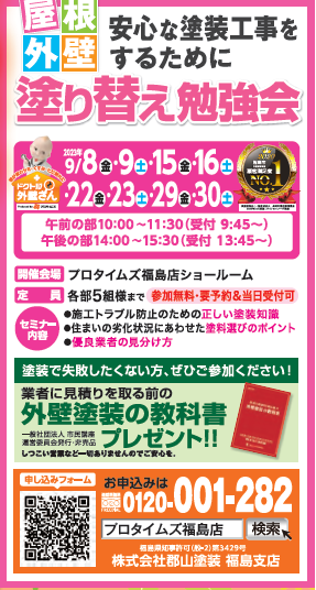 | お問い合わせ | 【プロタイムズ福島店 ㈱郡山塗装】 お問い合わせ番号:0120-001-282 WEBからのお問い合わせも可能です。 https://protimes-fukushima.com/contact/ |