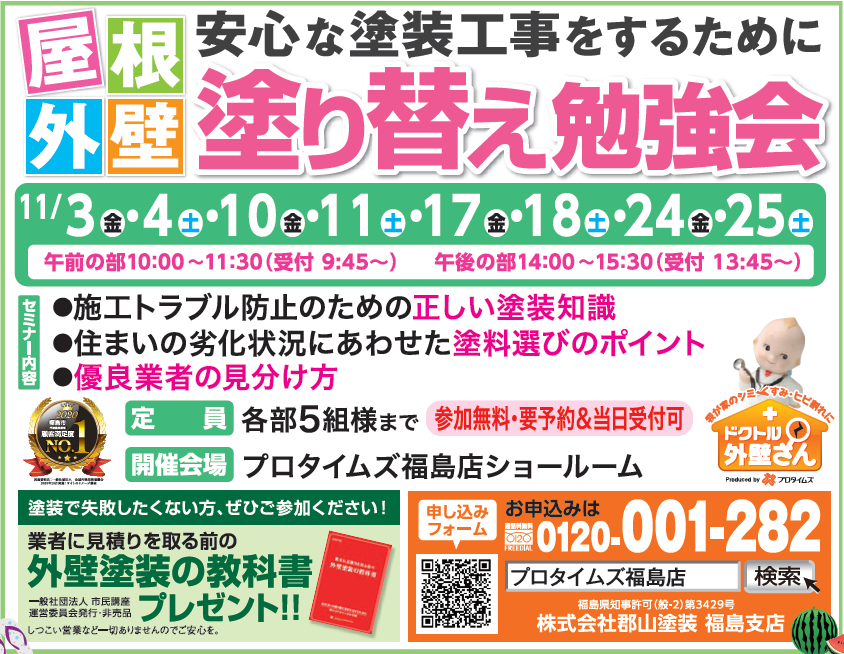 | お問い合わせ | 【プロタイムズ福島店 ㈱郡山塗装】 お問い合わせ番号:0120-001-282 WEBからのお問い合わせも可能です。 https://protimes-fukushima.com/contact/ |