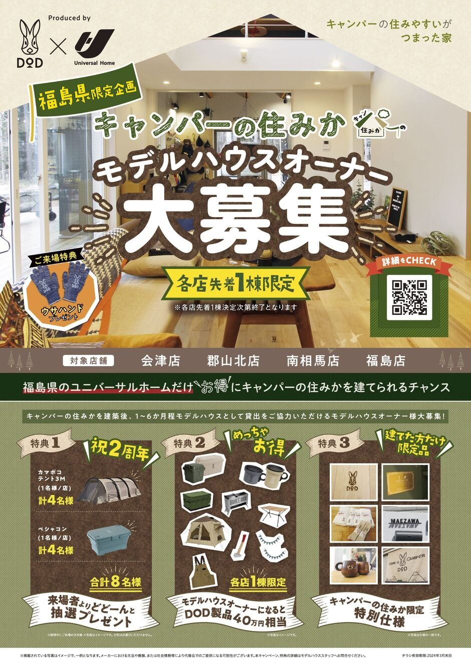 大人気アウトドアブランド『DOD』とのコラボレーション住宅『キャンパーの住みか』の福島県第1号をご建築していただける方を大募集しています。