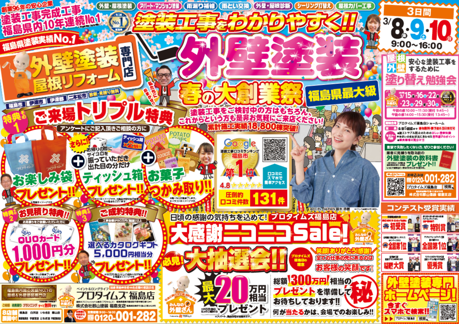 | お問い合わせ | 【プロタイムズ福島店 ㈱郡山塗装】 お問い合わせ番号:0120-001-282 WEBからのお問い合わせも可能です。 https://protimes-fukushima.com/contact/ |