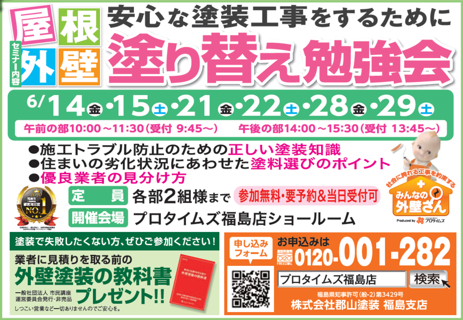 | お問い合わせ | 【プロタイムズ福島店 ㈱郡山塗装】 お問い合わせ番号:0120-001-282 WEBからのお問い合わせも可能です。 https://protimes-fukushima.com/contact/ |
