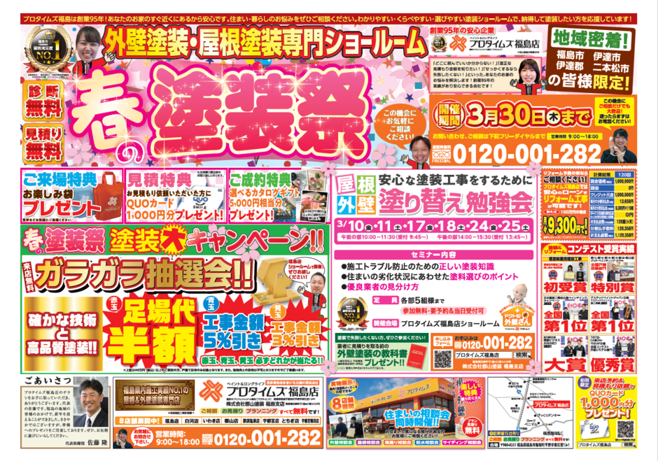 | お問い合わせ | 【プロタイムズ福島店 ㈱郡山塗装】 お問い合わせ番号:0120-001-282 WEBからのお問い合わせも可能です。 https://protimes-fukushima.com/contact/ |