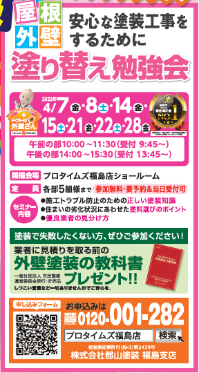| お問い合わせ | 【プロタイムズ福島店 ㈱郡山塗装】 お問い合わせ番号:0120-001-282 WEBからのお問い合わせも可能です。 https://protimes-fukushima.com/contact/ |