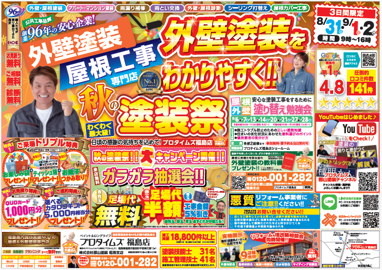 | お問い合わせ | 【プロタイムズ福島店 ㈱郡山塗装】 お問い合わせ番号:0120-001-282 WEBからのお問い合わせも可能です。 https://protimes-fukushima.com/contact/ |